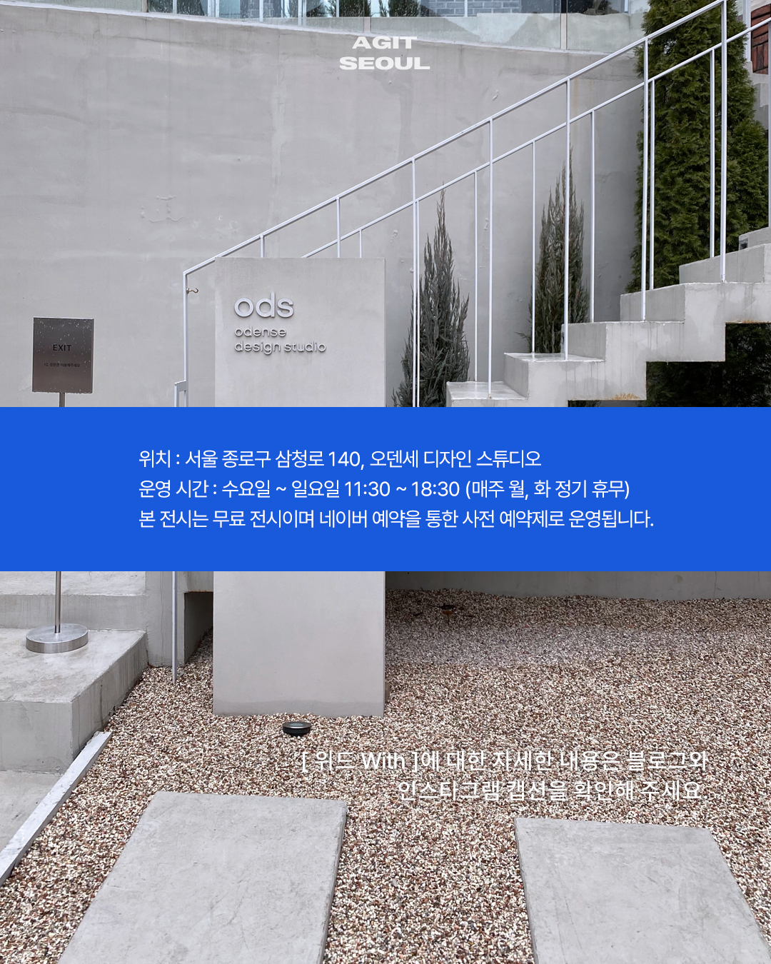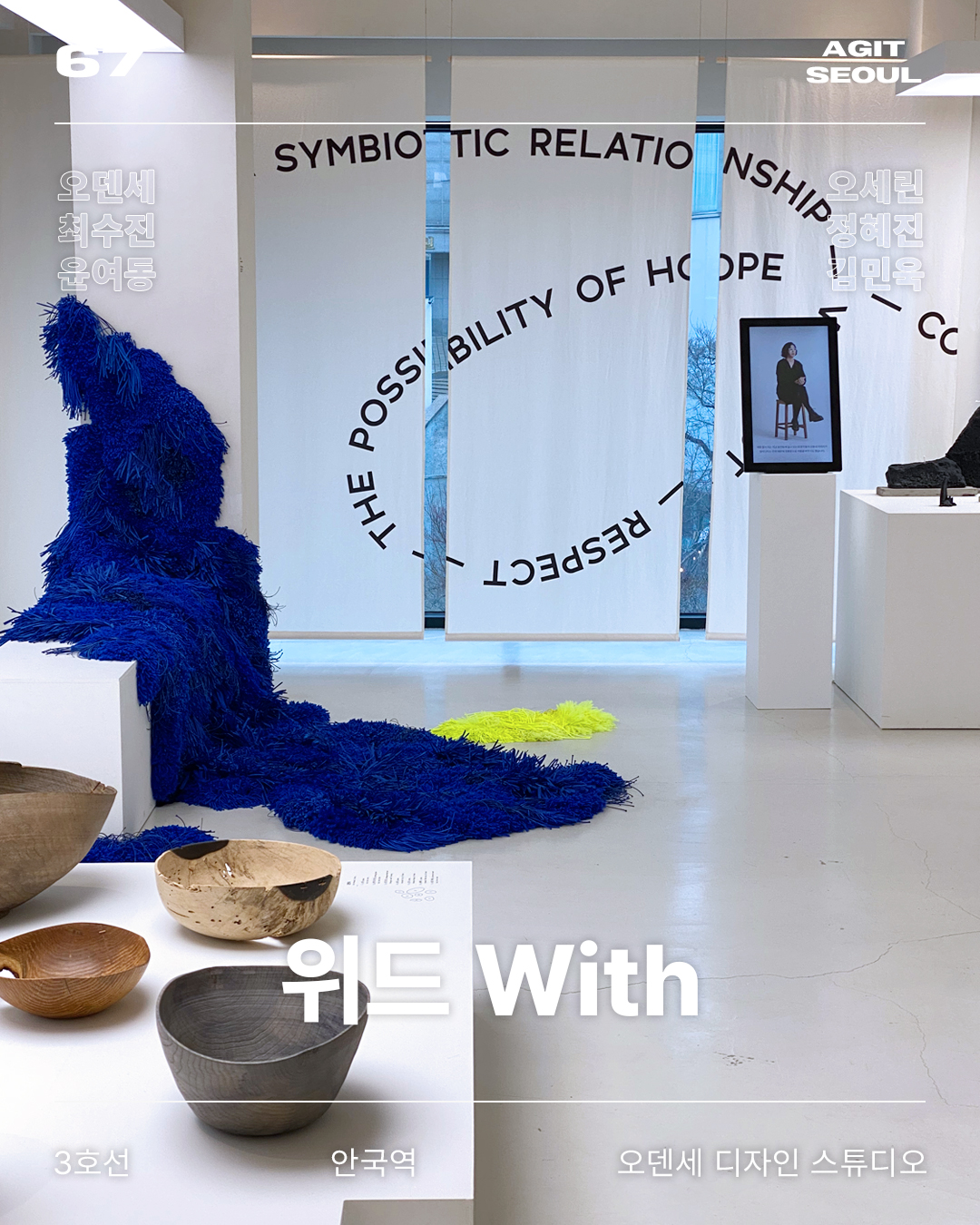 아지트서울의 67번째 전시회는 각기 다른 물성을 다루는 5인 작가가 모여 팬데믹으로 인해 함께이길 원하지만 함께할 수 없는 일상의 혹은 인간관계의 본질적 딜레마를 풀어내는 전시를 만나는 곳, 오덴세 디자인 스튜디오(ods) [ 위드 With ]입니다.