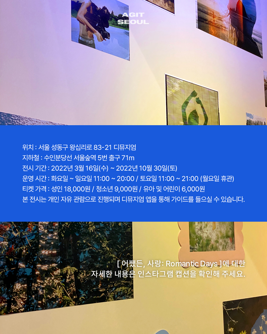아지트서울의 69번째 전시회는 ‘사랑'이라는 감정을 순정 만화를 모티브로 하여 사적이고 감각적인 작품 300여 점을 한자리에 만나볼 수 있는 대규모 기획 전시가 열리는 곳, 디뮤지엄 [ 어쨌든, 사랑: Romantic Days ]입니다.